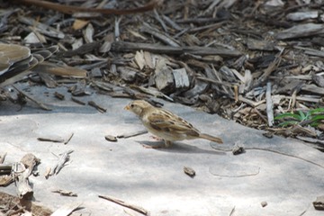 A sparrow looking for food on our flagstone path.