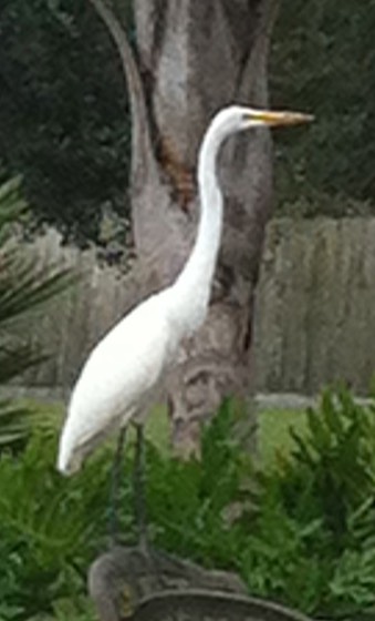 Great Egret standing on our pool furniture.