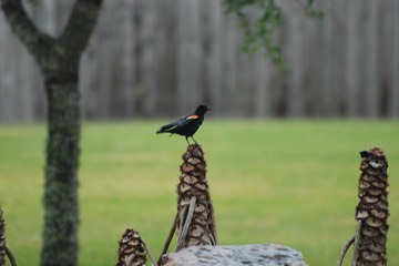 Red and Green Macaw sitting by a Military Macaw moving around.