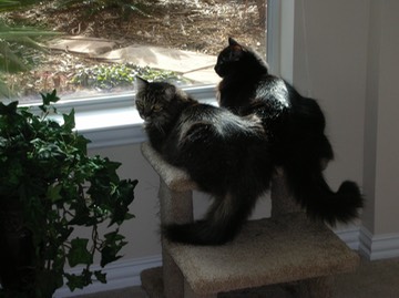 Cats watch birds through the family room window.