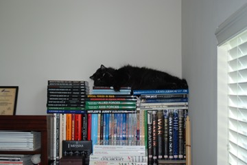 Ciera sleeps atop books in the study.