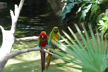 Red and Green Macaw sitting by a Military Macaw moving around.