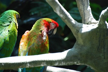 Red and Green Macaw sitting by a Military Macaw sleep.