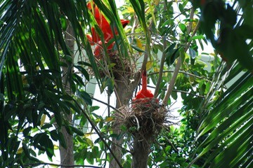 Red and Green Macaw sitting by a Military Macaw sleep.