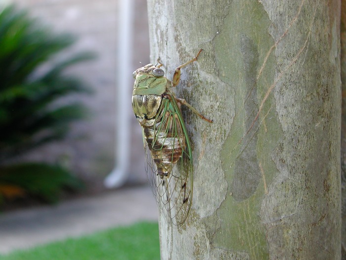 Cicada on crepe myrtle tree trunk.