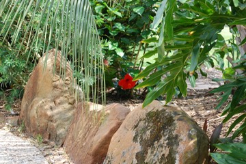 A picture of the hibiscus through some foliage.