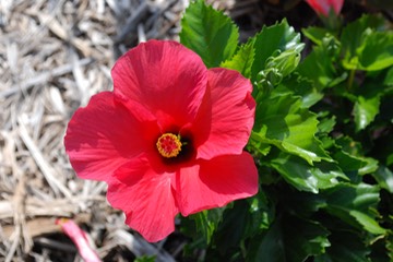 Close-up of a pinkish-red dwarf hibiscus.